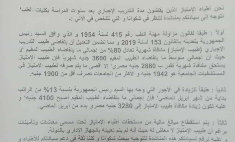 وقال أطباء وطبيبات الامتياز في مناشدتهم إلى رئيس الجمهورية، أنهم يقضون مدة التدريب الإجباري بعد سنوات الدراسة بكلية الطب، وطبقًا لقانون مزاولة مهنة الطب رقم 415 لسنة 1954 الذي وافق رئيس الجمهورية على تعديله بالقانون 153 لسنة 2019، وما تضمنه التعديل أن يتقاضى طبيب التدريب الإجباري(طبيب الامتياز) مكافأة شهرية تعادل 80% من إجمالي ما يتقاضاه الطبيب المقيم.