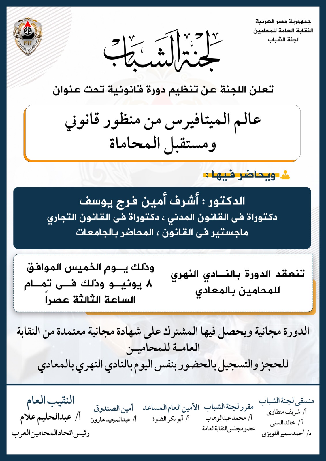 الخميس .. دورة عن “عالم الميتافيرس من منظور قانوني ومستقبل المحاماة”