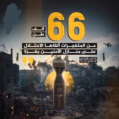قال مكتب الإعلام الحكومي في غزة إن الاحتلال ألقى على قطاع غزة أكثر من 66 ألف طن من المتفجرات على منازل الآمنين، ودمر أكثر من 360 ألف وحدة سكنية، و395 مدرسة وجامعة ومؤسسة تعليمية، و447 مسجدا و3 كنائس، وأخرج 83 مستشفى ومركزا صحيا عن الخدمة تماما، واستهدف 150 مؤسسة صحية وأعاقها عن العمل، و122 سيارة إسعاف، إضافة إلى تدمير قرابة 200 موقع أثري وتراثي بهدف مسح التاريخ والجغرافية الفلسطينية.