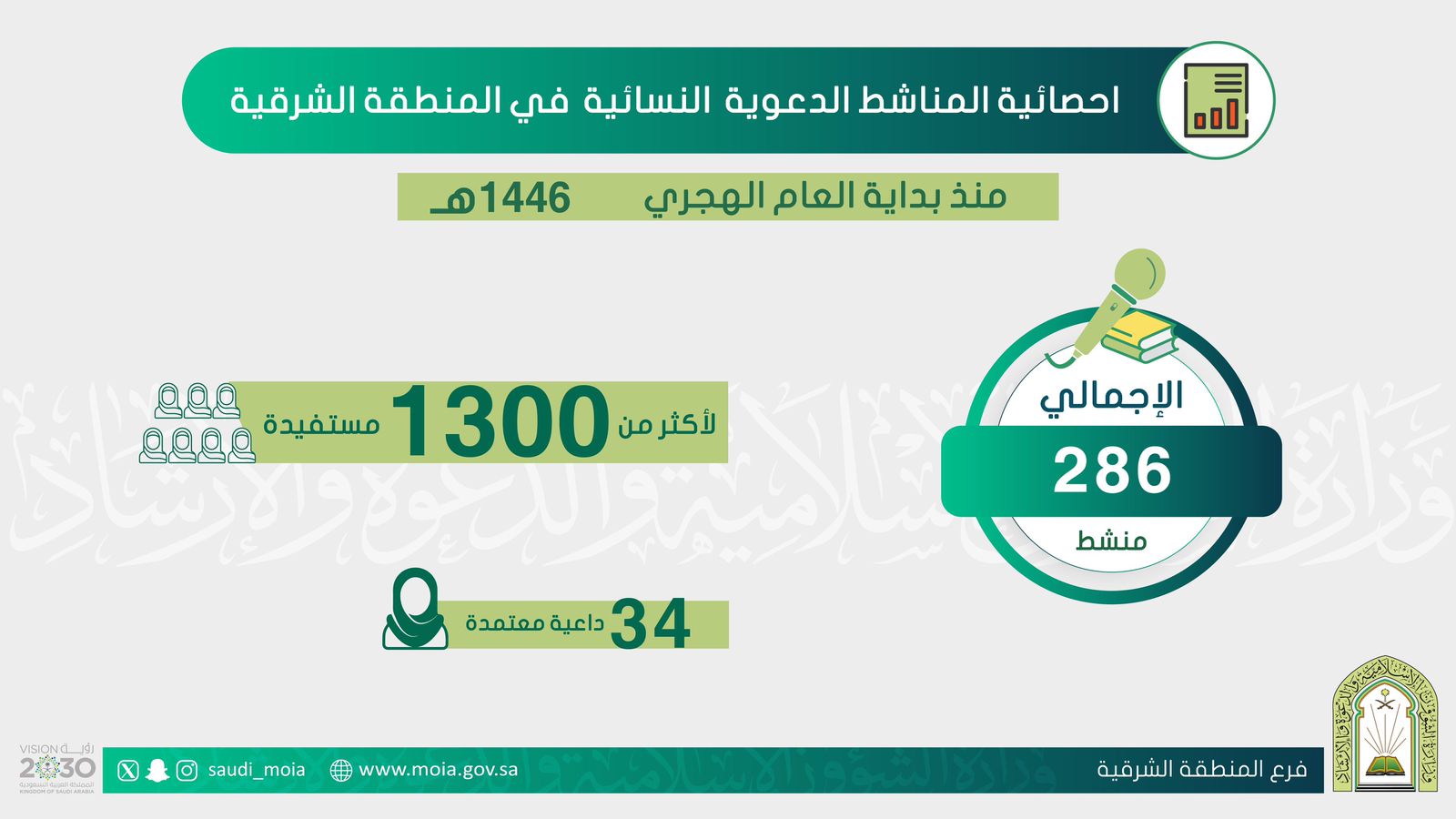 الدمام..الشؤون الإسلامية بالمنطقة الشرقية تنفّذ 286 منشطًا دعويًا نسائياً لأكثر من 1300 مستفيدة