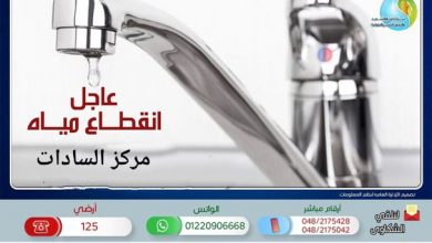 مياه المنوفية: قطع المياه يوم السبت عن مناطق بمركز السادات لـ 6 ساعات