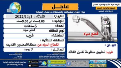 اسيوط/محمد عبدالراضى يونس أعلنت شركة مياه الشرب والصرف الصحى بأسيوط والوادي الجديد اليوم الثلاثاء ١ نوفمبر ٢٠٢٢ إنقطاع…