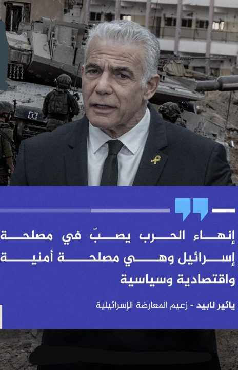 زعيم المعارضة الإسرائيلية: إنهاء الحرب في غزة يصب في مصلحة إسرائيل