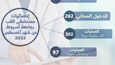 أسيوط/محمد عبدالراضى استقبلت مستشفى القلب بجامعة أسيوط ٣٦٢١ متردداً على العيادات الخارجية خلال شهر أغسطس ٢٠٢٣ تحت رعاية الدكتور أحمد…