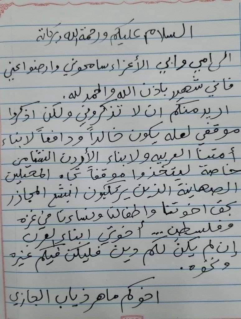 ماذا قال الشهيد الأردني ماهر الجازي في وصيته قبل القيام بعملية معبر الكرامة ؟