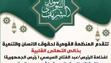 المنظمة القومية لحقوق الانسان والتنميه تهنئ الرئيس السيسي والامة الاسلامية والعربية بمناسبة حلول ذكري المولد النبوي الشريف